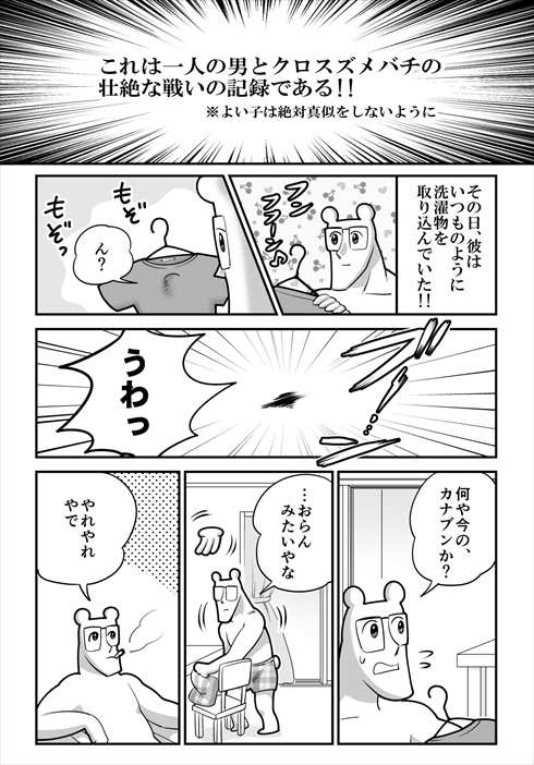 漫画は作者のも〜(@mori2ta)さんのお兄さんの実体験を描いたもの。お兄さんが洗濯物を取り込むと、一緒に虫らしきものが家に入り込んできました。はじめカナブンかと思ったそれはクロスズメバチだったといいます。