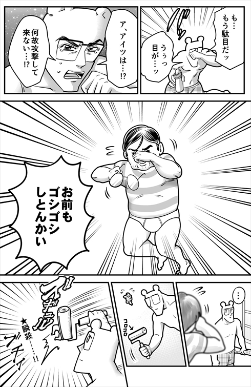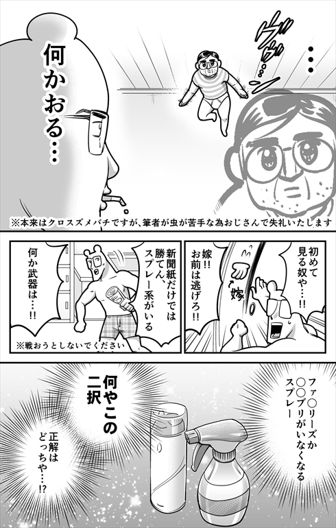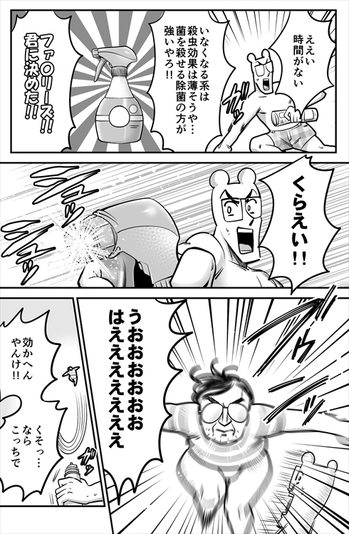 奥さんを逃し、迎え撃とうとするお兄さん。手近にある武器は、除菌スプレーかゴキブリがいなくなるスプレー。除菌のほうが強そうという判断で除菌スプレーを手に取るお兄さんでしたが効果なし。武器をゴキブリがいなくなるスプレーに切り替えます。
