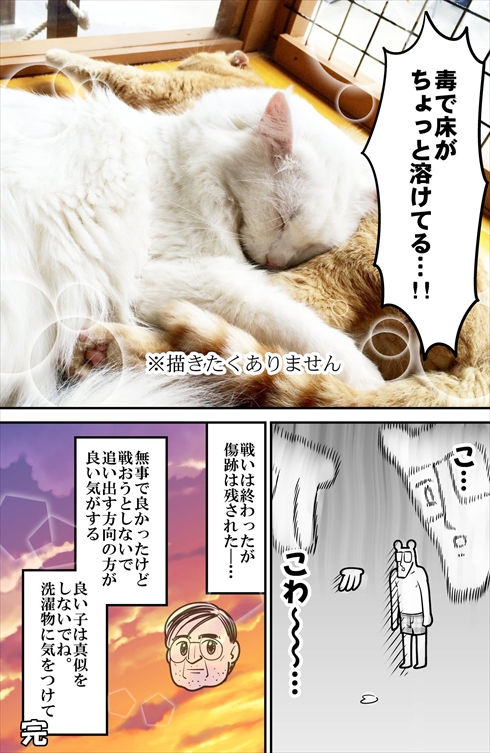 なお漫画の中でお兄さんが「ハチの毒で床がちょっと溶けた」と話す場面がありますが、も〜さんがその後専門家に問い合わせたところ、「たった1匹のクロスズメバチの体液で床が少し溶けたようになっていたというのはなかなか想像できない。殺虫剤を大量に撒布したため床が溶けたように見えてしまったのかも」との回答が得られたそうです。