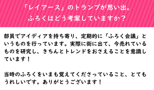 Q:「なかよし」のふろくは昔から豪華なイメージがあります。「レイアース」のトランプは今も思い出に残っています(年齢バレる)。ふろくはどのように考案されていますか?