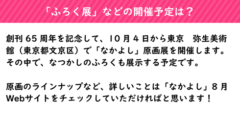 Q:なかよしの、特に90年代頃の付録や全員サービスが大好きです! 某誌でおこなわれていたような「ふろく展」などの開催予定はありませんか?