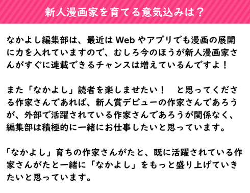 A:なかよし編集部は、最近はwebやアプリでも漫画の展開に力を入れていますので、むしろ今のほうが新人漫画家さんがすぐに連載できるチャンスは増えているんですよ!