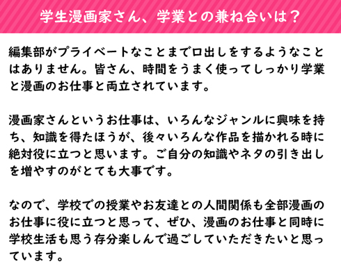 A:編集部がプライベートなことまで口出しをするようなことはありません。皆さん、時間をうまく使ってしっかり学業と漫画のお仕事と両立されています。漫画家さんというお仕事は、いろんなジャンルに興味を持ち、知識を得たほうが、後々いろんな作品を描かれる時に絶対役に立つと思います。ご自分の知識やネタの引き出しを増やすのがとても大事です。