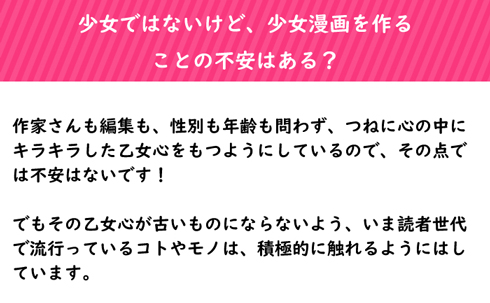 ―― 作家さん関係だとこんな質問も。一言でまとめるなら「少女じゃなくても、少女漫画は描けるのか」といったところでしょうか。