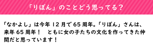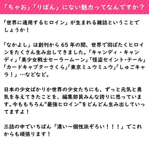 - Q:「ちゃお」や「りぼん」にない魅力ってなんですか? イベントなどがないので見えてきにくいなぁと思っています。