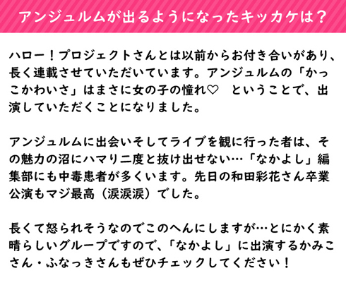 - Q:アンジュルムのメンバーが出るようになったキッカケは?