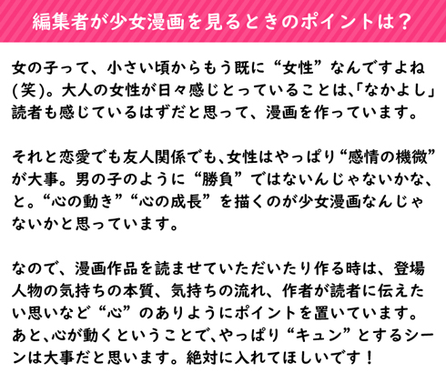 - Q:少女漫画編集ならではの、漫画を見るときのどういうポイントってありますか?