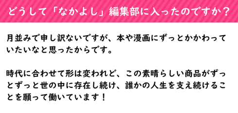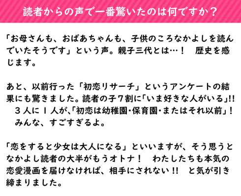 Q:「ちゃお」や「りぼん」にない魅力ってなんですか? イベントなどがないので見えてきにくいなぁと思っています。