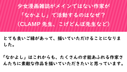 - Q:20代です。小学生のころりぼん、なかよし、ちゃおを渡り歩いていました。なかよしはCLAMP先生やこげどんぼ先生など、少女誌メインの作家さん以外の方が描かれていることがあるのが不思議でしたし、私はそれがとても好きでした。どういった経緯でこのような作家さんたちに描いてもらうことにしたのでしょうか?