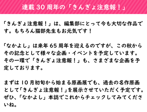 Q:「きんぎょ注意報!」が大好きで、昨今の名作アニメリバイバルブームに乗ってきん注も再アニメ化やグッズ化などしてほしいと心の底から願っております。 今年で連載30周年ですが特に動きがある訳でもなく、「なかよし」編集部ではもう忘れられた作品になってしまっているのでしょうか?というか猫部先生はお元気でしょうか・・・?