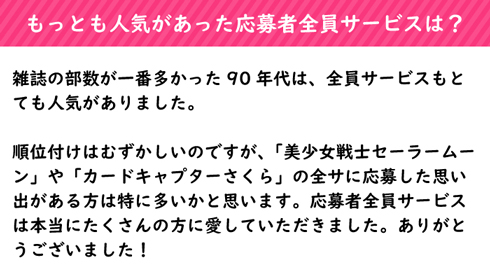 Q:毎月なかよしを買っている30代の女です。「カードキャプターさくら」が大好きで、新連載を機に20年ぶりに「なかよし」を買い始めましたが、ふろくがノートやシールではないことはもちろん、連載してる作品のグッズが付かないことに悲しくなりました。また、応募者全員サービスもなくなったのが悲しいです。無くなった理由を知りたいです。