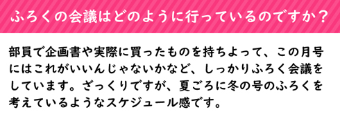 - Q:ふろくの会議はどのように行っているのですか? 1つのふろくにかかる企画期間など長くかかるものがありますか?