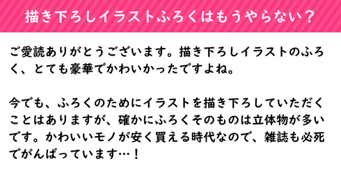 Q:なんだかんだで20年以上読んでいます。昔みたいな作家全員書き下ろしポストカードセット!とか、レターセットやシールの付録を見なくなりました。カラー扉も少なくなって残念なのに付録ばかりゴテゴテで子どものおこづかいでは無理そうな値段にびっくりしてます。あの頃は紙の付録ばかりだったけどほぼ描き下ろしで、付録もとても楽しみでした。描き下ろしイラスト付録はもうやらないんですか?