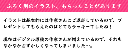 - Q:漫画家さんがふろくとかに使う小さいイラスト、サインも入っていないような小さいのって、終わったあとどうしてるんですか? かなり前にそういう小さいイラストをファンクラブを通じてもらったことがあるのでちょっと気になりました。