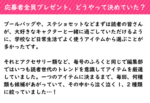 Q:応募者全員プレゼントの品はどうやって決められていましたか?