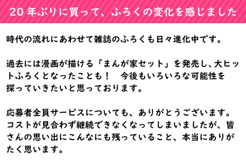 - Q:なかよしの、特に90年代頃の付録や全員サービスが大好きです! 某誌でおこなわれていたような「ふろく展」などの開催予定はありませんか?