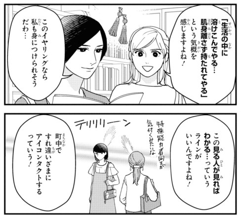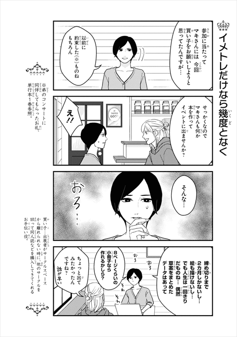 3巻では、近年のオタクグッズについて「生活の中に溶け込んで肌身離さず持たれてやるという気概を感じる」「見る人が見れば分かるラインがいい」「行く末は推しのコラボ老人杖」と語るエピソード、公式グッズではないけれど推しを感じて有名ブランドのアクセサリーを買ってしまうエピソードなどが描かれています。マキがイベントに初めてサークル参加して開会の拍手で涙する場面も。