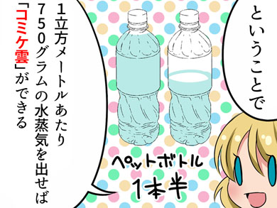 空気中に数グラムの水滴が浮かぶと濃い霧になるそうなので、1立方メートル当たり750グラムの水蒸気を出せば「コミケ雲」ができると考えられます。