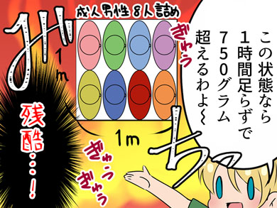 人間はじっとしている状態でも1時間に約25グラムの水分を放出するとされています。1平方メートルの空間に8人立っているとすると、それぞれがさらに75グラム、計100グラムの水蒸気を放出すれば、1時間足らずで750gを超えることになります。