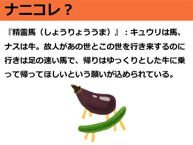 『精霊馬(しょうりょううま)』:キュウリは馬、ナスは牛。故人があの世とこの世を行き来するのに使い、行きは足の速い馬で、帰りはゆっくりとした牛に乗って帰って行ってほしいという願いが込められている。