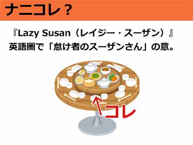 『Lazy Susan(レイジー・スーザン)』:英語圏で「怠け者のスーザンさん」の意。由来は不明だが、100年以上前の1917年には既に使用例があるという。