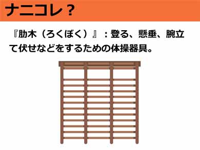 『肋木(ろくぼく)』:登る、懸垂、腕立て伏せなどをするための体操器具。日本の学校に導入されたのは大正時代で、かつては体育の授業に欠かすことのできない設備だった。