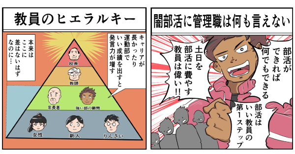 前回は「闇部活(※)」など、部活を長時間するためにガイドラインの抜け穴を突く教員たちの話をした。この問題の根底には“教員間の上下関係”があると思ってる。職員室内での立場を良くするために、部活を一生懸命やる先生がけっこういるんだよね。
