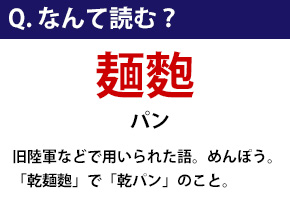 『パン』:旧陸軍などで用いられた語。めんぽう。「乾麺麭」で「乾パン」のこと。