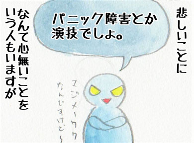 悲しいことに「パニック障害なんて演技でしょ」って心ないことを言う人もいます。本当に、そう思われても仕方がない症状なんです。でもそれが現実に発作として起こることに私は軽く絶望しました。