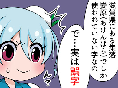例えば「」という字。これは滋賀県にある集落「妛原(あけんばら)」でしか使われていない字なのですが、実はこれは誤字。正しくは下のような字を使うはずのものでしたが、横棒が1本無駄に入ってしまったのです。
