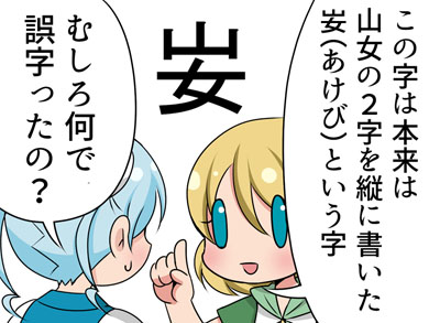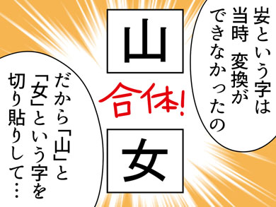 なぜそんなミスが? これは、当時変換できなかったこの字を「山」と「女」を貼り合わせて作ったときに、切れ目の影が横棒に見えてしまったからだ、とされています。そんなうっかりミスで漢字が間違って生まれてしまうなんて、驚きですよね。