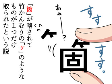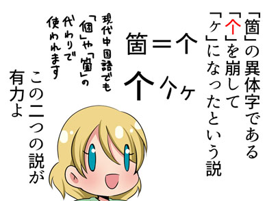 この「箇」が略されて、竹かんむりの「ヶ」のようなものが1つだけ取られたという説と、「箇」の異体字である「个」を崩して「ヶ」になったという説が有力なようです。「个」は現代中国語でも「個」や「箇」に代わりとしてよく使われています。