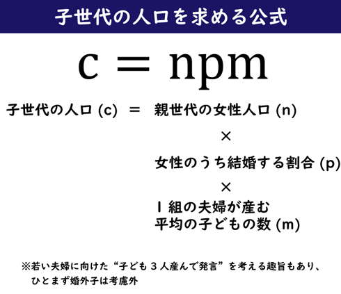 • 子世代の人口=親世代の女性人口×女性のうち結婚する割合×1組の夫婦が産む平均の子どもの数