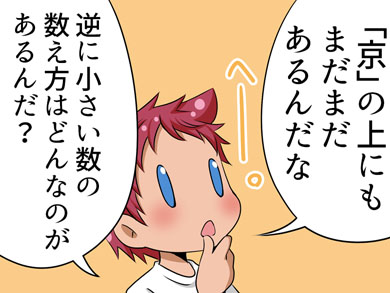 なじみのある「兆」の次は「京(けい)」。スーパーコンピュータ「京」の名前の由来としても知られています。さらにその次は「垓(がい)」「●※(じょ)」と続いて、そこからは……。