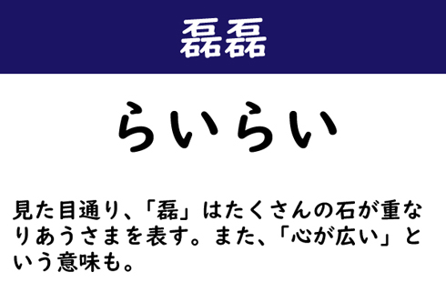見た目通りだが、「磊」はたくさんの石が重なりあうさまを表す。また、「心が広い」という意味も。