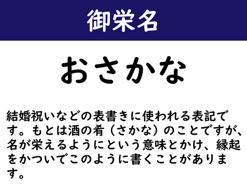 結婚祝いなどの表書きに使われる表記です。もとは酒の肴(さかな)のことですが、名が栄えるようにという意味とかけ、縁起をかついでこのように書くことがあります。