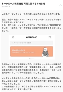 OpenChatはLINEアプリ上で8月19日から正式にサービス開始となりましたが、匿名で好きな話題のチャットルームが作成できるという性質上、出会い目的などの規約に違反した書き込みが相次いだことで問題化(関連記事)。8月20日以降は検索機能が利用不可能になっていました。