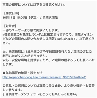 再開にあたり同社は、一定基準を満たしたトークルームの表示を優先的に行うなどの最適化を施すほか、不適切なトークルームの検知やモニタリングの体制を強化したとのこと。機能開放の対象となるのは18歳以上のユーザーで(※年齢認証が行えない環境の場合は利用不可)、10月17日15時から段階的にランダムに開放していきます。