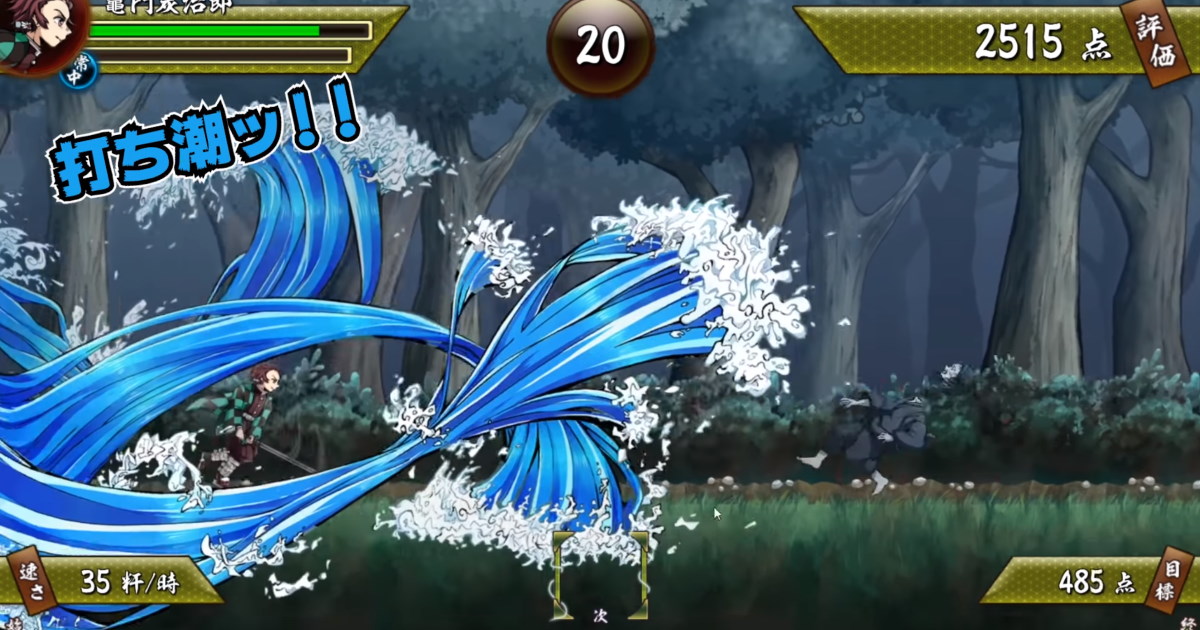 炭治郎、善逸、伊之助からキャラを選べるのですが、最初は炭治郎を選んでプレイ。鬼が来るたび「打ち潮ッ!!」と声を上げて切っていく姿がファンとしてはたまりません。また、善逸を使っているときは、「霹靂一閃!」と声真似も聞かせてくれます。