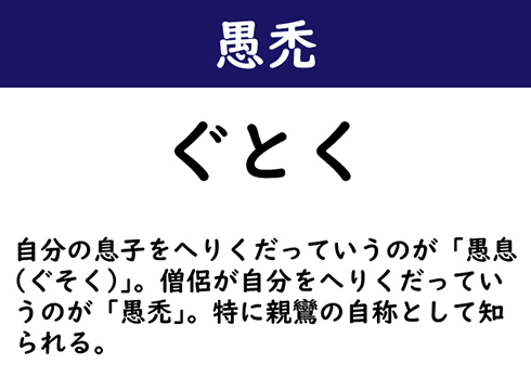 自分の息子をへりくだっていうのが「愚息(ぐそく)」。僧侶が自分をへりくだっていうのが「愚禿」。特に親鸞の自称として知られる。