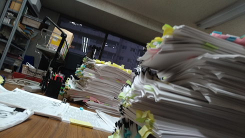 「第4版のゲラ、まだ社内にありますよ」と見せてもらっていたら、机の上がこんな状態に