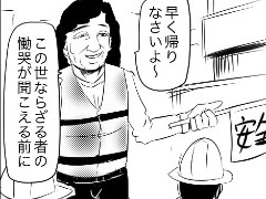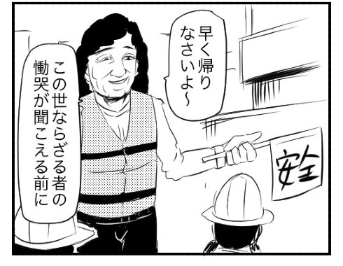 交通安全の旗を持ち、下校する生徒たちを見守るおばさん。「早く帰りなさいよ〜」と声をかけるところまでは普通ですが、その後に続くのは「この世ならざる者の慟哭が聞こえる前に」。一気に来た。