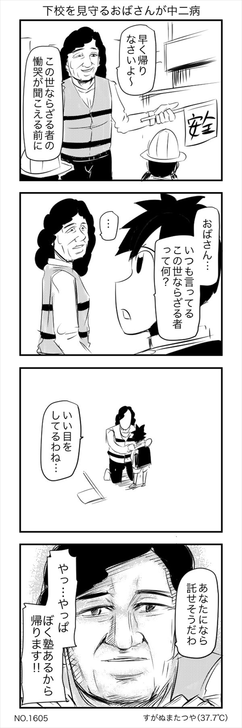 通学路を見守る緑のおばさんが痛々しい中二病を発揮する4コマ漫画「下校を見守るおばさんが中二病」がじわじわ来ます。