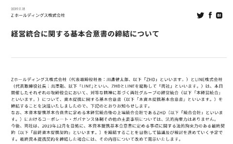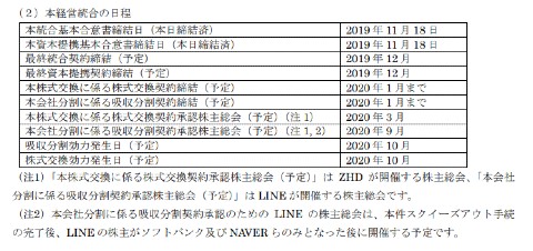 2019年12月をめどに、法的拘束力のある最終契約を締結することを目指して協議と検討を進めていく予定としています。また統合に向けた一環として、両社が共同してLINEの株式について公開買付けなどを行い、LINEを非公開化する旨の提案をLINE取締役会に対して行うことで合意したとしています。