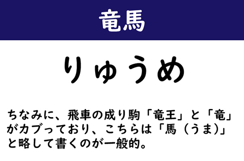 - 【昨日の問題】「竜馬」の読み方は?(将棋の角の成り駒。「りゅうま」と1字違う読み方は?)