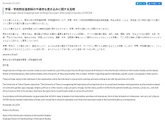 同学環長・学府長の越塚登さんは「これらの書き込みは、当該教員個人または兼務先組織に関するものであり、学環・学府の活動とは一切関係がありません」とした上で、「学環・学府構成員から、こうした書き込みがなされたことをたいへん遺憾に思い、またそれにより不快に感じられた皆様に深くお詫び申し上げます」と謝罪しています。