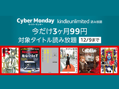 「今年最後のビッグセール」と銘打ったAmazon.co.jpのセール「Amazonサイバーマンデー」が12月6日から開催されるのに先立ち、電子書籍読み放題サービスKindle Unlimitedが、3カ月間99円で利用できるキャンペーンが始まっています。キャンペーンは12月9日23時59分までです。