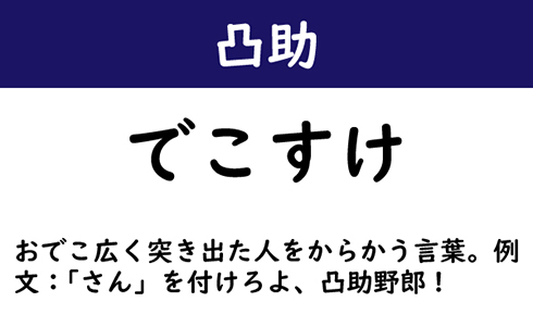 おでこ広く突き出た人をからかう言葉。例文:「さん」を付けろよ、凸助野郎