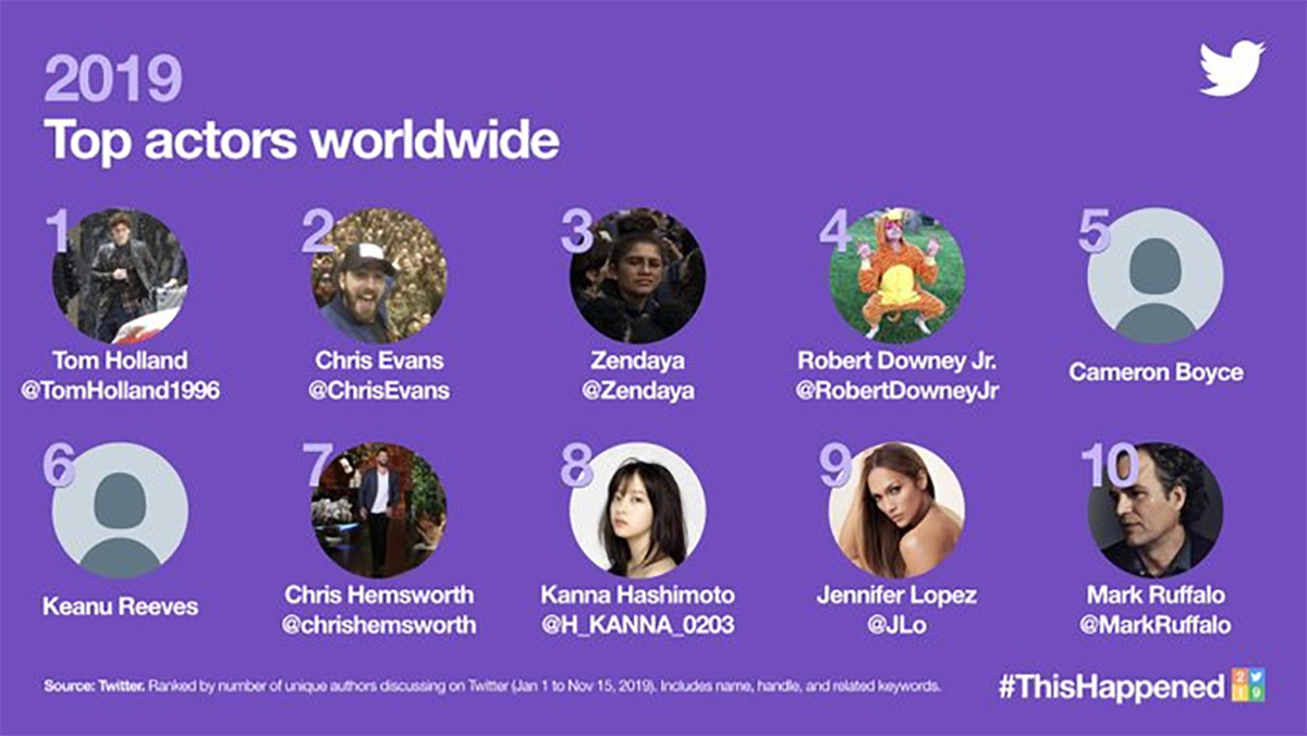Twitter社は、2019年1月1日〜11月15日にかけてTwitterユーザーに言及されたテーマをテレビ番組、映画、俳優、ミュージシャンなど分門ごとにランキング形式で発表。橋本さんは俳優部門の第8位にランクインしており、日本人では唯一の選出となりました。