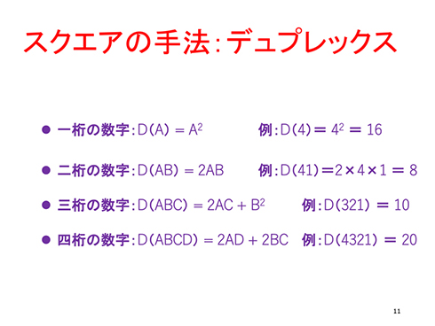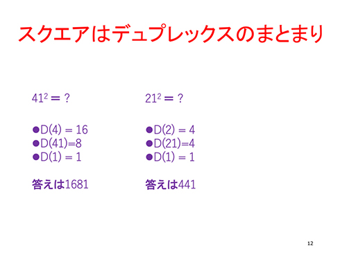 スクエアは、デュプレックスのまとまり。例えば、41のスクエア(41の2乗)は4、41、1のデュプレックスを並べるだけです。